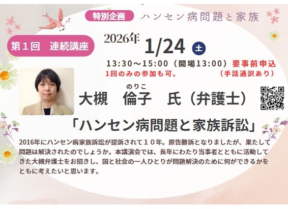 特別企画「ハンセン病問題と家族」で開催される、特別講座 第1回「ハンセン病問題と家族訴訟」(講師:大槻倫子 氏)の概要はこちらからご確認いただけます。 (約3秒後に、特別企画ページへ自動的に切り替わります)