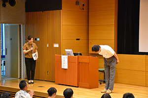 当館では、昨年度からハンセン病問題に取り組んでこられた様々な職業の方をお招きしてそのご経験をお話ししていただく職業シリーズの講演会を開催しております。第1回目は、2018年12月に「講演会 ソーシャルワーカーを目指すあなた達に伝えたいこと/講師:坂手悦子氏(国立療養所邑久光明園福祉課ソーシャルワーカー)」を開催しました。第2回目は、2019年6月に「講演会 報道マンに訪れた”人間回復”~ハンセン病回復者との出会いから~/講師:小川秀幸氏(三重テレビ放送報道制作局長)」を開催しました。本日の第3回目は、現在現役の学校の先生としてご活躍している佐久間建先生(東京都立武蔵台学園府中分教室・主任教諭)をお招きして、「ハンセン病問題を学び、伝えるということ~学校現場から~」をテーマにお話を伺いました。