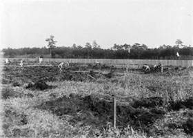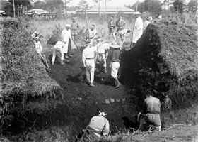 土塁を崩し、堀を埋める患者作業風景 (白衣の人物は作業を監視する病院職員) |