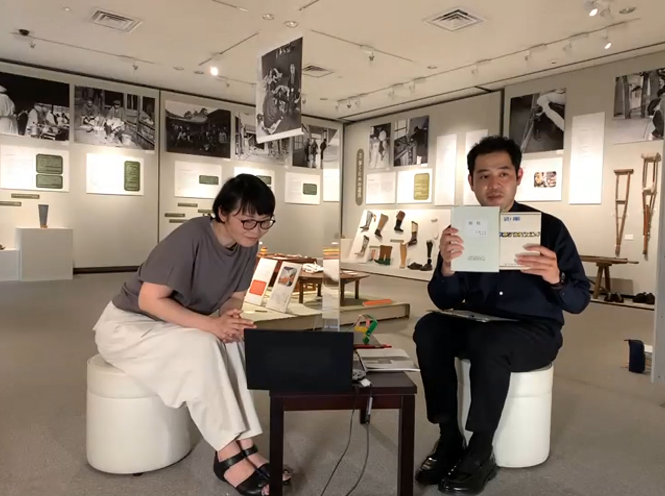 本イベントでは企画展「生活のデザイン」の成り立ちと概要について説明し、続けて事前収録の映像を通じて、療養所における患者作業と障害、道具の関わりのあらまし、義足、補装靴、補装具などを集めた「歩くための道具」と、ピンセット、ボタン掛け、自助具付きのスプーンやフォークなどを紹介する「手で使う道具」について解説しました。