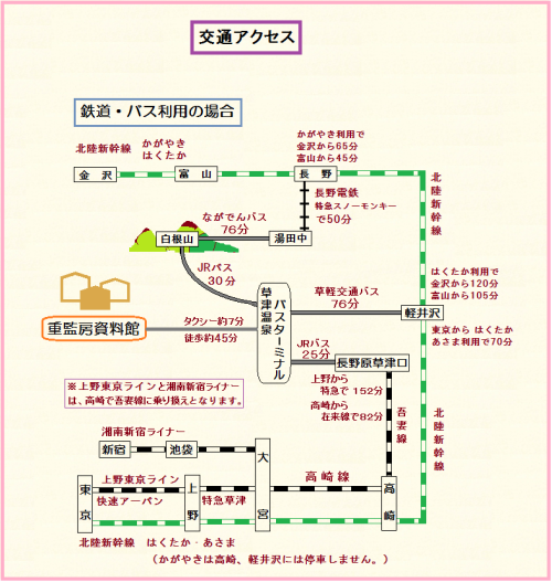 北陸新幹線の金沢開業に伴って、富山県や石川県からご来館される皆様のアクセスが改善されました。これまで富山駅から草津温泉バスターミナルまでは、ほくほく線経由で片道約5時間30分以上かかっていましたが、軽井沢まで直通の新幹線を利用しますと3時間20分となり、およそ2時間10分も短縮されます。このほか、夏場には最速の「かがやき」を利用すると長野から志賀草津高原ルートを使って白根山を越えるルートも利用可能となりますので北陸方面からの草津温泉観光巡りもぐっと便利になりました。また、上野東京ラインの開業で高崎線直通となった神奈川、沼津方面のアクセスも大変良くなりました。皆様のご来館をお待ち申し上げております。