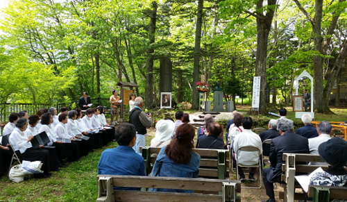 草津町にある頌徳公園でコンウォール・リー女史の生誕祭が行われました。1857年5月20日生まれのリー女史は、58歳のころから草津町に実在したハンセン病患者の集落「湯之澤区」に住み、聖バルナバ・ミッションと呼ばれる救済活動をした人です。99年前のことですが、湯之澤区は楽泉園自由地区の母体であり、リー女史は今でも多くの回復者から慕われています。今年はそのリー女史が生誕して158年目にあたります。生前リー女史が愛したマーガレットの花は、今でも楽泉園の園花となって入所者の皆さんが大切にしておられます。当館の庭に今年も咲いたマーガレットの花一輪を捧げてリー女史の生誕をお祝いして来ました。