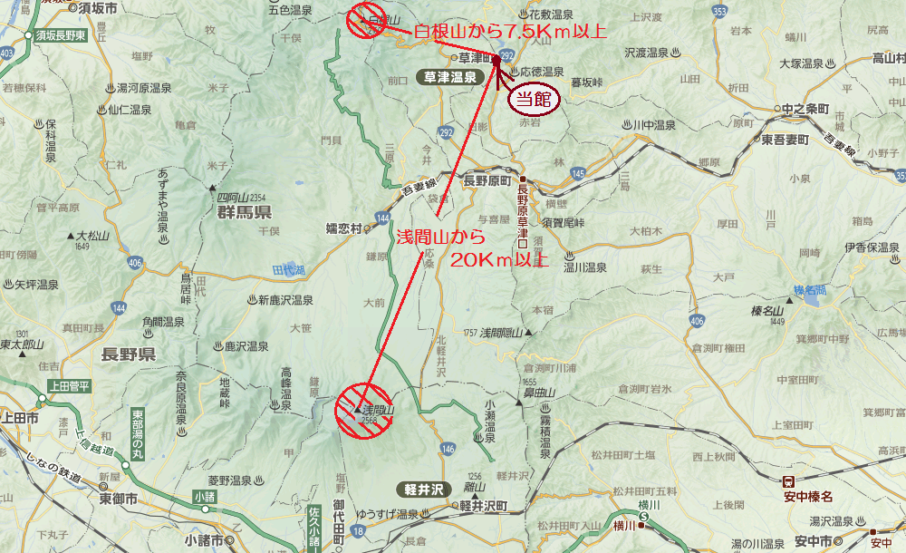 昨日、浅間山の小規模な噴火のニュースがありましたが、当館までは大変距離がありますのでご安心下さい。今回、噴火警戒レベル2になった浅間山から当館までは直線距離で20Km以上、昨年からレベル2にある草津白根山からも7.5Km以上離れており、仮に中規模以上の噴火が起きた場合でも、草津町のハザードマップでは当館は火砕流などの被害想定区域外になっておりますので特段の影響はないとされています。気象庁によりますと、噴火警戒レベル2とは「住民は通常の生活が出来るが、火口周辺への立入は規制」と言うことです。
