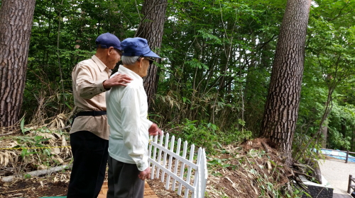 7月2日に跡地展望台の一般公開が始まり、栗生楽泉園自治会の藤田会長、岸厚生常任のお二人が視察しました。一般公開は7月1日に予定していましたが、天候不順で1日延期となっていたものです。展望台は、跡地を一望できる高台にあります。手作りのため粗末な造りですが、遺構の全体像をご覧いただけるように工夫しました。足元に気を付けて登ってください。なお、地盤がやわらかいため車イスでは登れませんのでご承知おきください。