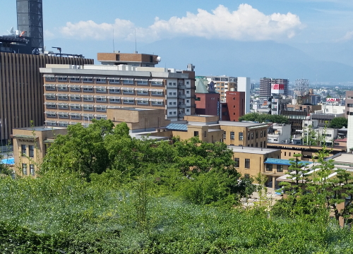 城跡から臨む山梨県庁舎、奥は会場となった防災新館
