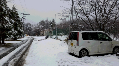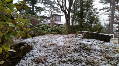 重監房資料館の周辺では今年初の雪となりました。11月25日の13時ごろからポツポツとあられの様なものが落ちてきました。夕方にはあたり一面うっすらと白く変わりました。
