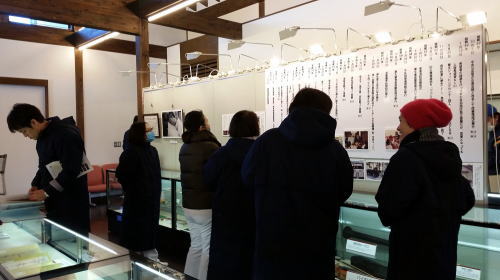 栗生楽泉園では、4月の異動時期を迎え、新たに着任された職員さんの研修が行われています。その一環として4月11日に当館や社会交流会館を含む園内史跡見学が行われました。皆さんは昼間の気温2度というあいにくの寒空の中で熱心に学芸員の解説に耳を傾けていました。