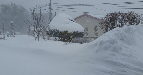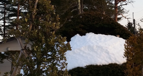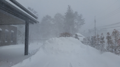 ここ数日暖かい日が続き、2日前まで小春日和に誘われて当館前の大きなイチイの木に雀たちが集まって日向ぼっこしていました。今朝は一変、猛烈な吹雪になり雀のお宿も真っ白なキノコになってしまいました。
