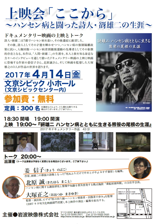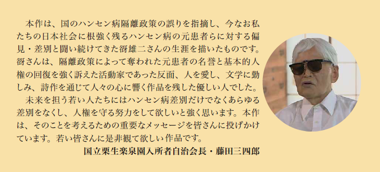 長年にわたり当館の開設に奔走された元患者で詩人の故・谺雄二さんの三回忌を偲んで昨年秋に開催した企画展「人間・谺雄二」に合わせて公開したドキュメンタリーが栗生楽泉園入所者自治会の企画で改定版「谺雄二ハンセン病とともに生きる」としてリニューアルされました。これを記念して、来る4月14日金曜日19時より、文京シビックセンター2階小ホールにおいて完成試写会が開催されます。開場は18時30分、開演は19時からです。上映後の20時からは関係者によるトークショーも行われます。当館の北原主任学芸員も登壇する予定です。なお、これに先立ち、2月22日に多磨全生園入所者自治会にご協力をお願いし、多磨全生園入所者を対象とした先行試写会を同園内で開催しました。今は病床にあられる前多磨全生園入所者自治会長で国立ハンセン病資料館語り部の佐川修さんにもご覧いただき「大変良い出来だ。」とのご感想をいただきました。お時間のある方は、是非お誘いあわせのうえ文京シビックホールにてご覧ください。