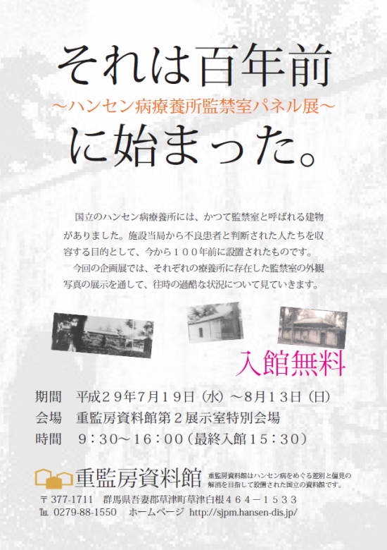 今年は、ハンセン病療養所に初めての監禁室(所)が設置されてから100年目にあたります。懲戒検束規程に基づいて運用されたと言われる各地の監禁室(所)には療養所内の秩序維持を目的に「不良患者」と言われた人達が収容されました。もちろん栗生楽泉園にも設置されていましたが草津には特別病室(重監房)があったために監禁室はほとんど使用しなかったと言われています。重監房資料館では、監禁室(所)設置100年目となる今年「それは百年前に始まった。」と題して来る7月19日から8月13日にかけ、平成29年度前期企画「ハンセン病療養所監禁室パネル展」を開催します。