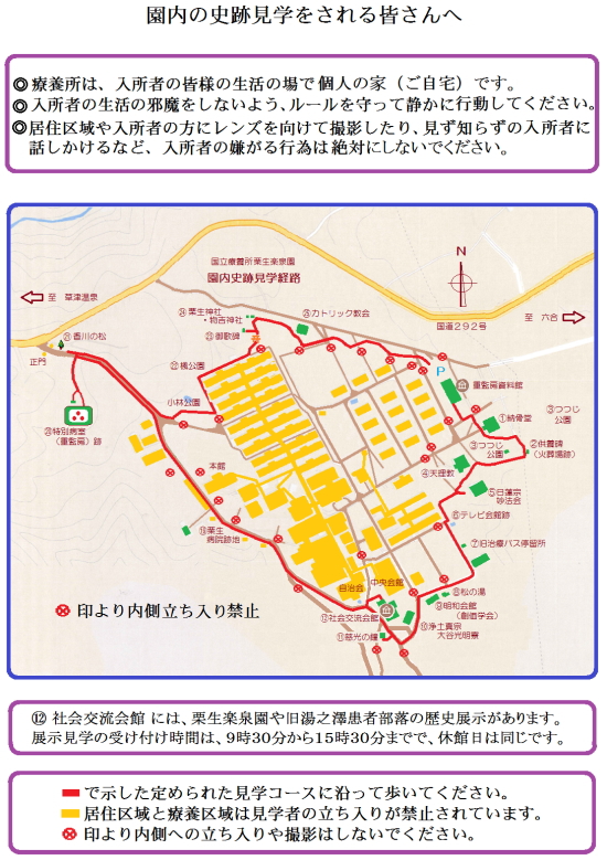 社会交流会館に学芸員が配置されたことに伴い、8月から国立療養所栗生楽泉園内に遺された数々の歴史を物語る園内史跡が冬の間を除いて一般公開されることになりました。園内の史跡散策には、入所者の皆さんの平穏な生活を守るために制限があります。ルールを守って入所者様のご迷惑にならないようご協力をお願いします。史跡見学は展示見学の時間に加えて1周およそ1時間程度を要します。ご希望の場合は資料館受付にお申し出ください。園内散策マップを差し上げます。