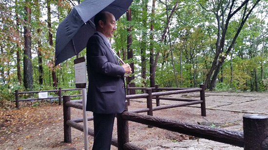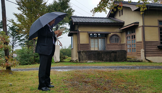 雨の中、重監房跡を視察する川野課長