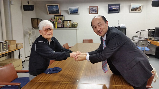 入所者自治会の藤田三四郎会長と握手を交わす川野課長