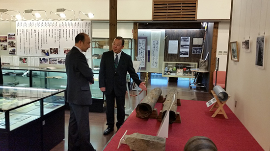 社会交流会館の学芸員から古い温泉導引管の解説を聞く