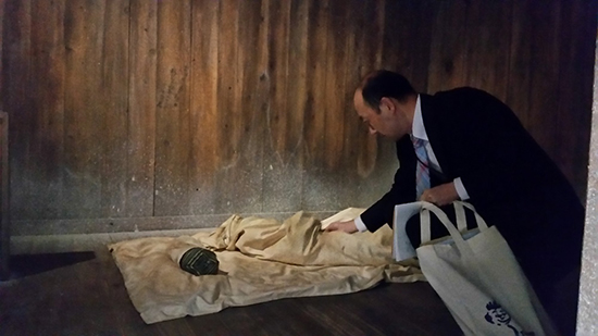重監房資料館にて(房内で布団の感触を確かめる)