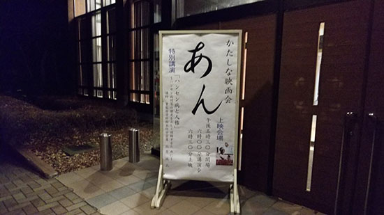 12月1日に片品村教育委員会主催の映画会が開催され、「あん」が上映されました。当館では、同教育委員会からのご依頼を受けて、会場となった片品村文化センターのエントランスホワイエで「それは百年前に始まった-ハンセン病療養所監禁室-」のプチ・パネル展を行いました。また、上映に先立って「ハンセン病と人権」と題する講演をし、老若男女多くの村民の皆様にハンセン病の歴史や人権啓発の大切さについて話しをお聞きいただきました。