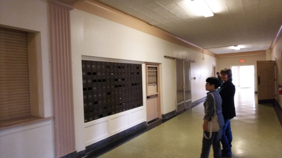 元郵便局にあった私書箱を見る研究員OBのRobbinsさん(手前)と学芸員のElizabethさん。