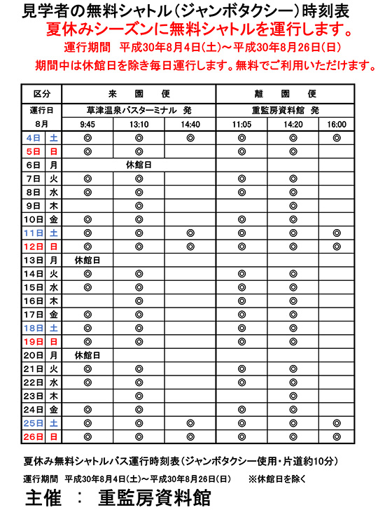 夏休みシーズンを利用してご来館いただく皆様のために、8月4日から8月26日の間、草津温泉バスターミナルから当館まで無料シャトルバス(ジャンボタクシー)を運行しますので是非この機会に見学にお越しください。