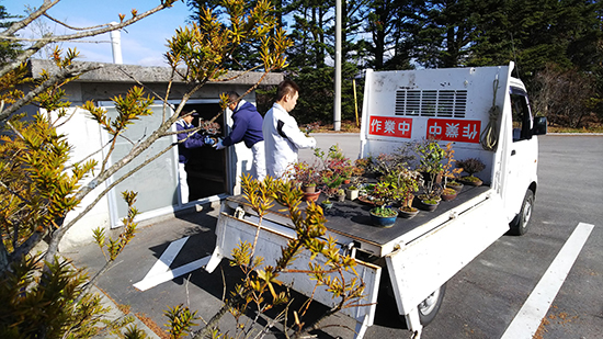 当館駐車場の入口付近には、入所者の方の室(むろ)が1棟あります。毎年、この時期になると厳しい雪の季節に備えて大切にされている盆栽の冬ごもりの準備をします。11月18日(日)持ち主の入所者の方の指導を受けて生活介助係りの職員さん達が、ひとつひとつ丁寧に室に運び込みました。盆栽達はここで静かに冬を越し、暖かくなる春には再び舎の庭に帰ります。