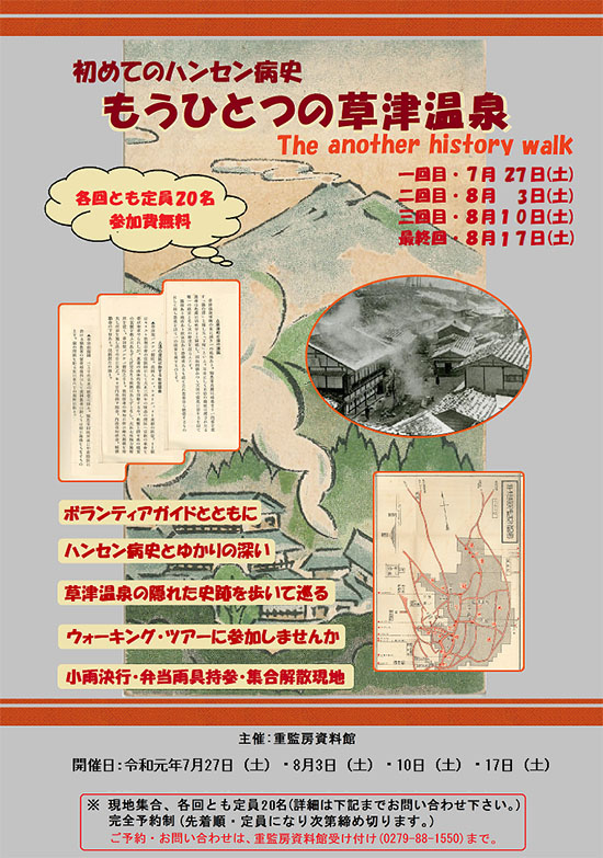 夏休みシーズンに合わせ、7月27日から8月17日までの毎週土曜日に実施するボランティアガイドによるウォーキング・ツアー「初めてのハンセン病史-もうひとつの草津温泉-」の参加者を募集します。催行人数は各回20名で定員になり次第締め切ります。古来より草津温泉は「万病に効能あり。」と謳われ、多くの病者に慕われた国内有数の湯治場でした。町内には、明治20年から昭和17年までハンセン病を患った人々が暮らした「湯之澤」や大正期に病者の救済にあたったコンウォール・リー女史にゆかりのある史跡が点在しています。ウォーキング・ツアーではボランティアガイドの案内でこうしたハンセン病ゆかりの地を1回あたり約6時間かけて徒歩で巡り、隠れた史跡を探訪するほか、重監房跡や旧青年会館など楽泉園内の歴史的建造物、資料館などを見学します。参加条件は長時間の徒歩移動が可能な体力のある人で、野外活動に適した服装であること、弁当、飲物、雨具はご持参いただきます。特にこの時期の水分補給は重要ですので各自ご注意願います。小雨決行です。当館(電話 0279-88-1550)までお電話にてお申し込みください。