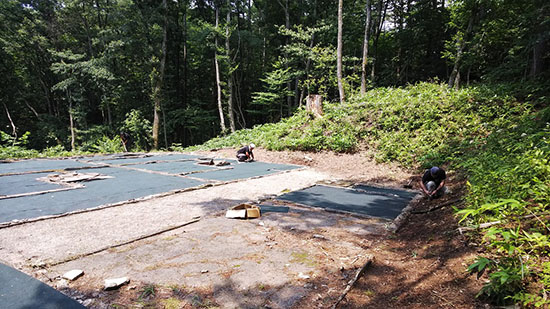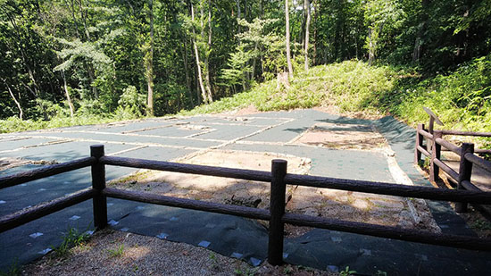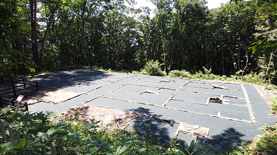 近年、著しい雑草の繁茂で重監房跡のコンクリート基礎が破損する危険があるため、跡地の雑草を根こそぎ駆除し、むき出しの地表面を防草シートで被う保全処理を行いました。以前に比べて良好な保存状態を維持できるとともに、コンクリート基礎の輪郭も鮮明に見ることができます。