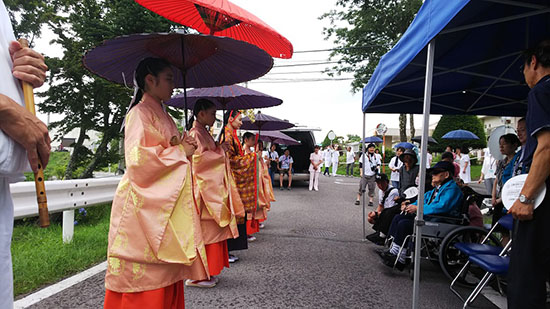 8月2日に草津温泉祭りのメインイベント温泉女神献湯の儀が執り行われ、楽泉園藤の湯にも女神一行が訪れました。自治会の藤田三四郎会長や坂本園長はじめ入所者や関係者が見守る中、儀式は滞りなく終了しました。