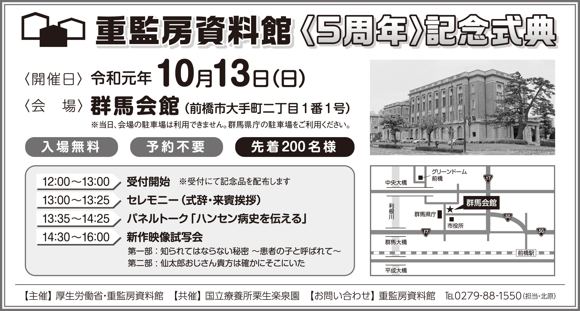 重監房資料館は、今年で開館5周年となったことを記念し、10月13日(日)13時から前橋市の県庁前にあります群馬会館で開館5周年記念式典を行います。セレモニーに続き、ゲストを招いてのパネルトークや新たに制作した啓発映像の試写会も行います。一般参加は、予約不要で先着200名様まで群馬会館正面玄関ホールで12時から受け付けします。なお、駐車場がありませんのでお車で来場される方は、群馬県庁の駐車場(有料)をご利用くださるか、近隣のパーキングにお停めくださるよう、ご協力をお願いします。