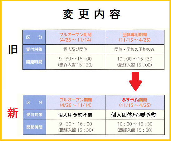 これまで冬季のご予約を5名様以上の団体のみとさせて頂いておりましたが、今シーズンから「団体専用期間」を廃止し、個人でも1名様からご予約可能となりました。冬季のご来館は事前にお電話等でご予約をお願いいたします。