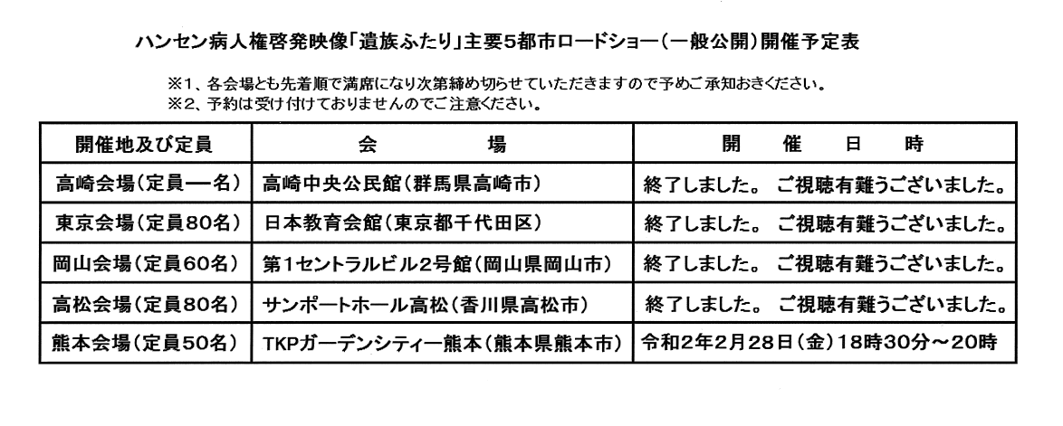 令和2年1月18日(土)の高崎会場をかわきりに、東京会場、岡山会場、高松会場、熊本会場の順に5都市でロードショーを開催いたします。