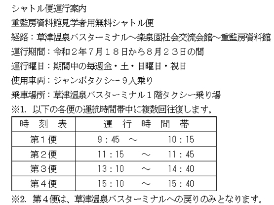 当館では令和2年7月18日から8月23日の間、毎週金・土・日曜日・祝日に、草津温泉バスターミナルから栗生楽泉園社会交流会館経由で重監房資料館までの無料シャトル便(ジャンボタクシー)を運行します。夏休みを利用して当館や楽泉園社会交流会館を見学される皆様はお気軽にご利用ください。詳しくは下記運行時刻表をご参照ください。(7/12記述訂正)