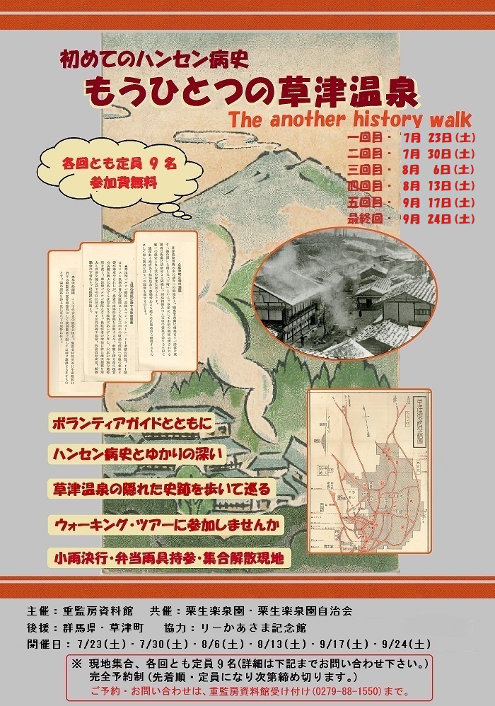 7月23、30日、8月6、13日、9月17、24日に実施するボランティアガイドによるウォーキング・ツアー「初めてのハンセン病史-もうひとつの草津温泉-」(共催:栗生楽泉園・栗生楽泉園自治会、後援:群馬県・草津町、協力:リーかあさま記念館)の参加者を募集します。催行人数は各回9名で定員になり次第締め切ります。古来より草津温泉は「万病に効能あり。」と謳われ、多くの病者に慕われた国内有数の湯治場でした。町内には、明治20年から昭和17年までハンセン病を患った人々が暮らした「湯之澤」や大正期に病者の救済にあたったコンウォール・リー女史にゆかりのある史跡が点在しています。ウォーキング・ツアーではボランティアガイドの案内でこうしたハンセン病ゆかりの地を1回あたり約5~6時間かけて徒歩で巡り、隠れた史跡を探訪するほか、重監房跡や楽泉園社会交流会館、資料館などを見学します。参加条件は長時間の徒歩移動が可能な体力のある人で、野外活動に適した服装であること、弁当、飲物、雨具、マスクはご持参いただきます。特にこの時期の水分補給は重要ですので各自ご注意願います。小雨決行です。当館(電話 0279-88-1550)までお電話にてお申し込みください。