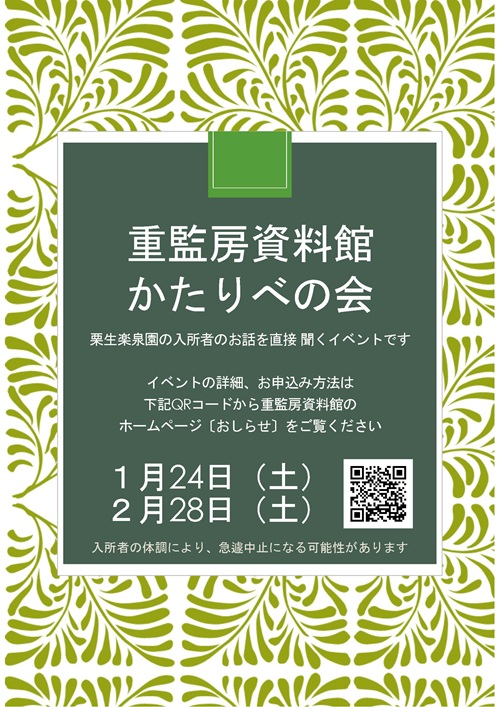 ◆「かたりべの会」でお話いただく入所者はご高齢のため、体調がすぐれない時や悪天候の場合などは予告なく中止したり、お話しの途中で打ち切ることもあります。予めご了承ください。