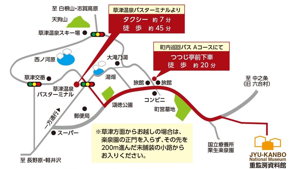 カーナビゲーションを利用される場合は、特別な住所であるため、全く違う場所に誘導される場合がございます。国立療養所栗生楽泉園正門を目標にお越しくださいませ。(国立療養所栗生楽泉園正門を入らないよう、お願い致します。国道292号線をさらに六合村方面に200mほど進んだ、斜め右手の未舗装の小道奥になります。)